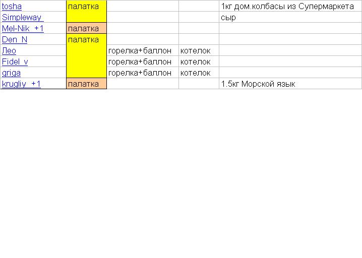 Если будет скажем 3 горелки и у кого есть пусть берут маленькие котелки (0,5-1.5л) этого хватит.Понятно что кружка,ложка,миска,это идивидуально.