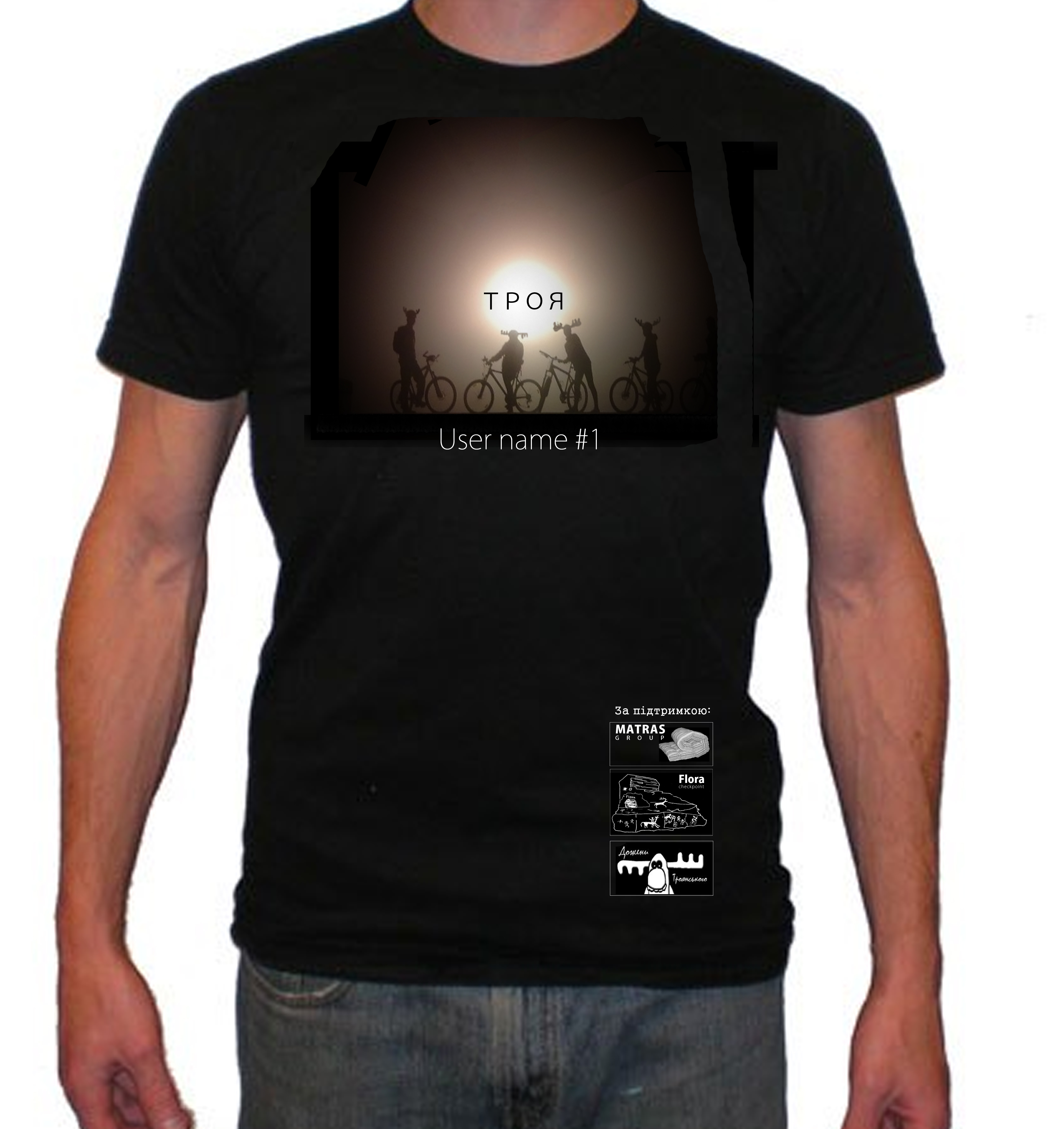 надпись и шрифт я отфанаря написал, а вообще зачем в множественном? это именные футболки Троянский Лось КрутьВерть итд я думал еще с никами...Нужно похоронную рамку убрать, чтоб фон плавно сливался с картинкой. Ну и если так подписывать то хоть в множественном числе, а если имеется в виду покатушка, то так и написать "Дожени тро...."