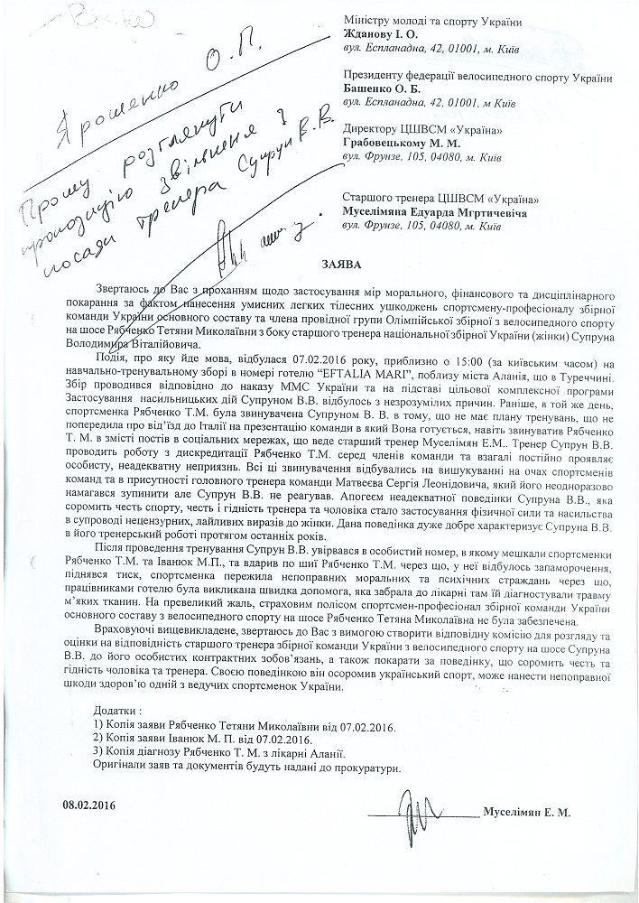 Рекомендувати державному тренеру Олегу Ярошенко звільнити Володимира Супруна з посади головного тренера жіночої збірної команди по шосе (федерація не має прямого впливу на рішення працівників міністерства, звідси ми можемо тільки рекомендувати прийняти відповідні дії);