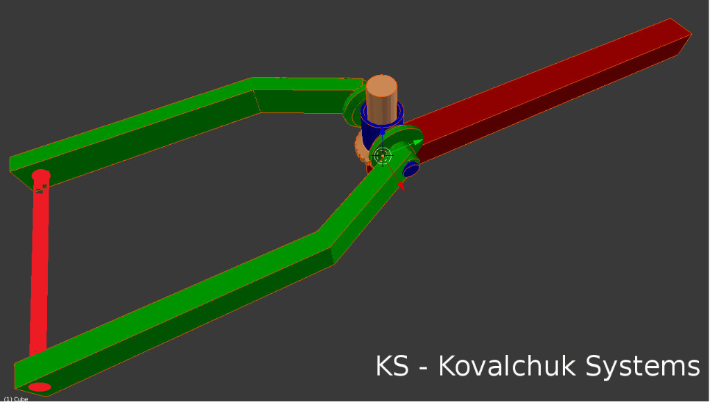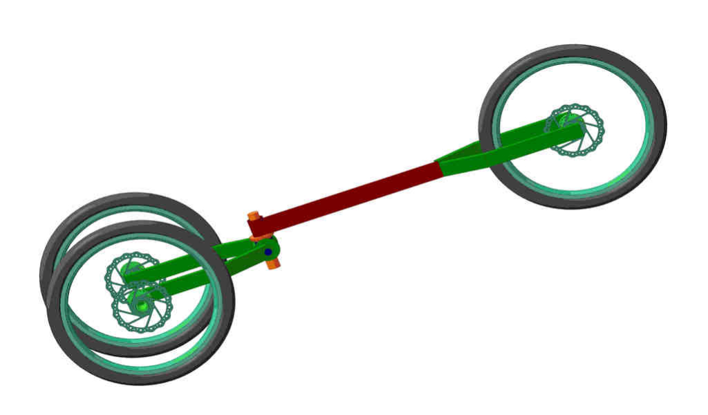 При повороті, за рахунок тяг керування зовнішнє колесо йде вниз, а внутрішнє колесо йде вгору. Синя втулка з 2 осями повертається щодо осі закріпленої на рамі.