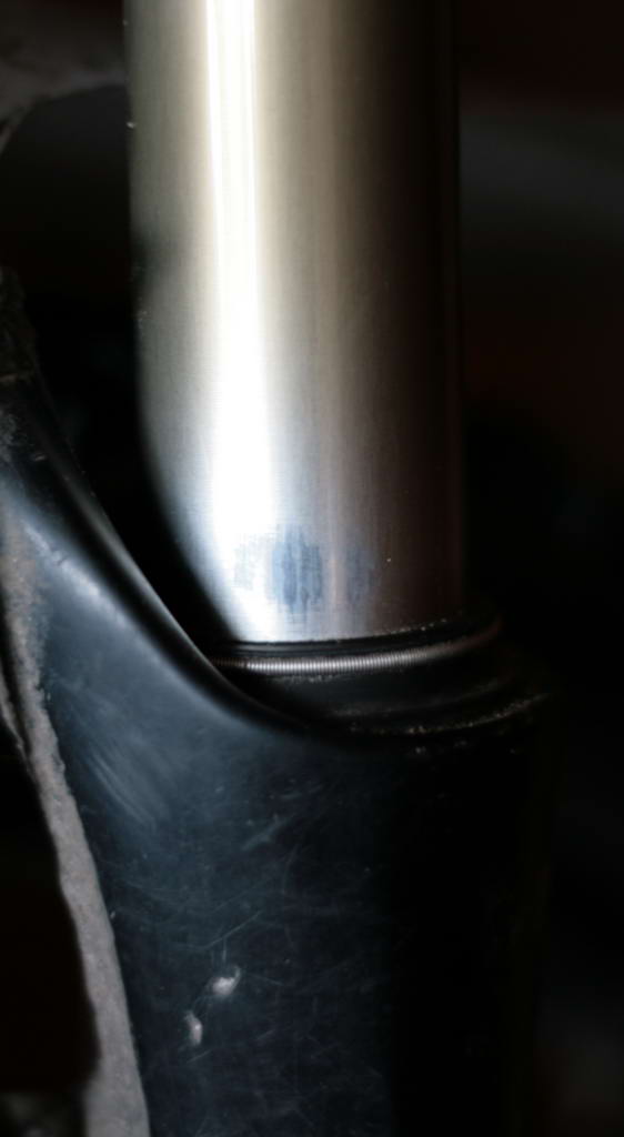У меня на вилке немного стертое покрытие от этого она в том месте чуть темнее и с переливами как масляная пленка на воде, если смотреть прямо то желтоватое пятно. В принципе, не страшно, не воздушка, главное люфта нет, проблема в другом, моя течет.