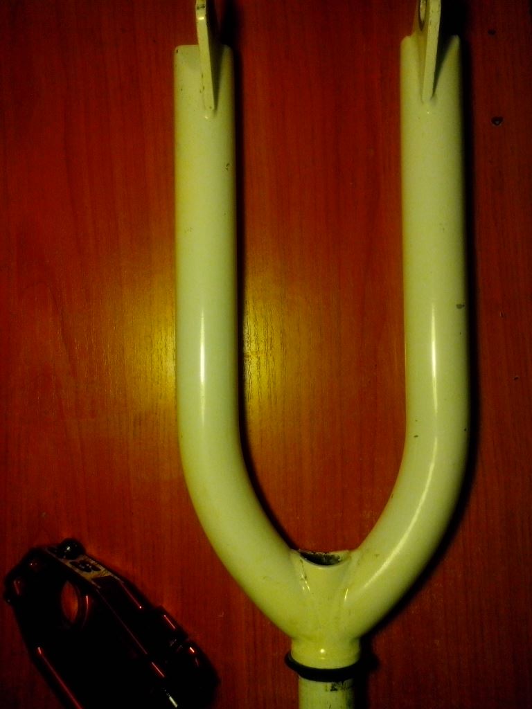 Есть небольшие царапины, вилка перекрашена в белый цвет; трещин , вмятин - нету; не гнута.