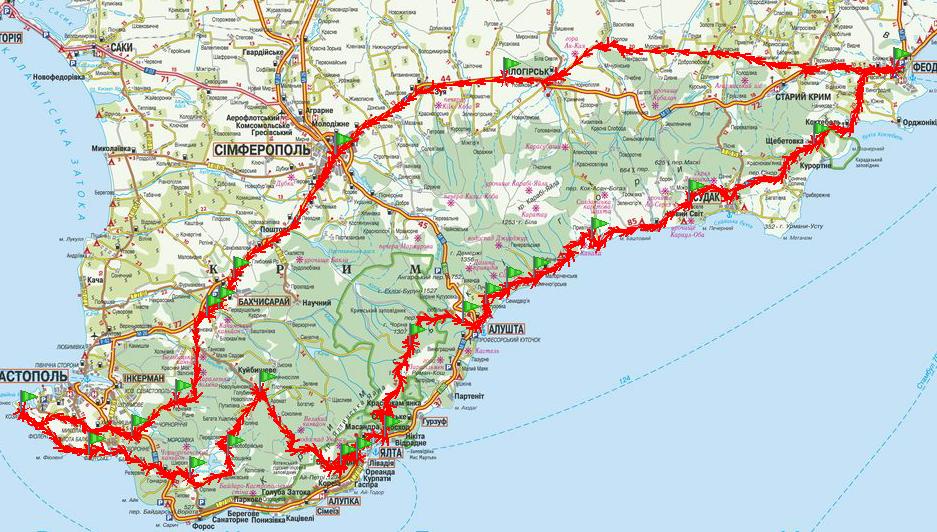 По поводу маршрута по Крыму, то он ещё не утверждён руководителем. Поетому выкладываю для рассмотрения проложеный мною мегаматрас на 500км