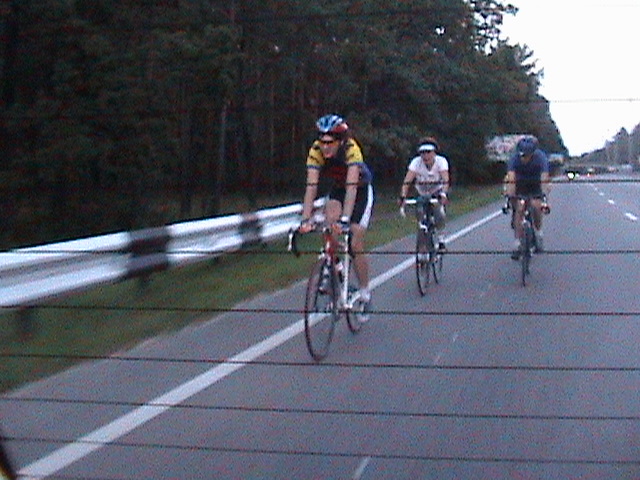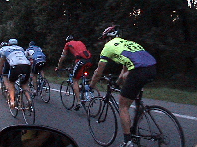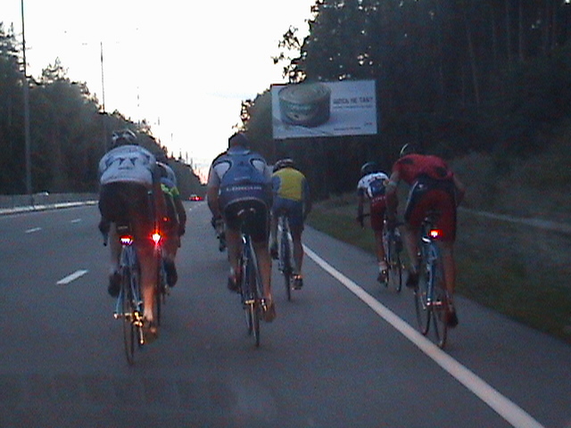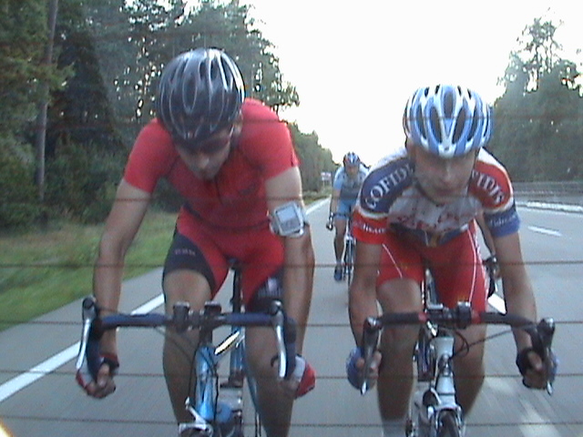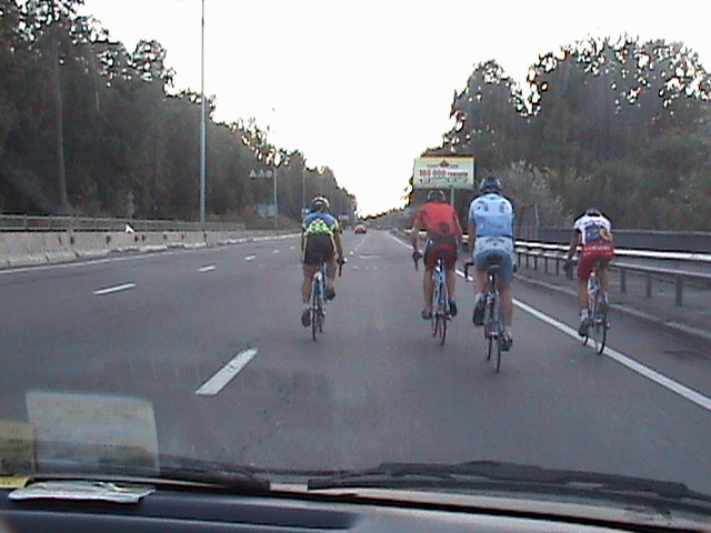 Після виїзду на загальну дорогу я розпрощався з колегою, він показав мені на моїй же карті, куди рухатись далі. Рухатись по дорогах в них якось стьомно. В нас все чітко – ти рухаєшся по дорозі в першому ряду, якщо перед перехрестям перший ряд повертає на право, і ти перебудуєшся в другий – ніхто не буде проти. Тут з цими постійними велодоріжками все якось заплутано. Ділянки дороги по-за містом, де велосипеди мають право їхать в правій і єдиній полосі – позначені червоним трикутником із зображенням велосипада. Найнеприємнішим є такий прикол. Їдеш по вищезгаданій дорозі, доїзжаєш до спуску, і тут у тому напрямку, в якому спуск, справа відокремлюється полоска шириною метр, може метр 20, і стоїть знак вело/пішодоріжки. Виглядає приблизно як обочина. Проїзжа частина відокремлена жирною суцільною білою лінією. Але десь через кожні 15-20 м НА ВІДСТАНІ 20 СМ ВПРАВО ВІД ЛІНІЇ СТОЯТЬ СТОВБЧИКИ ВИСОТОЮ ДЕСЬ МЕТР! Як виявилось, пластмасові. Тобто спуск, швидкість, поворот, ширина десь метр, навіть менше (до речі, зустрічні, що йдуть в підйом, по-ідеї мають право рухатись по проїзжій частині – там-то «велодоріжки» нема), і стовбчики, які дістають до руля, і які не стоять на роздільній смузі, а фактично прямо на полотні велодоріжки. І оскільки вони стоять не густо, кожен новий стовбчик вимагає.. еее... п’ялення у нього, для оцінки його відстані від роздільної смуги, яка постійно сприймається боковим зором. Але ж ми знаємо (як ще Лопес в своїй книжці вчив ))), що не можна поглядом вперіщуватись в перешкоди, по велик їде туди, куди ми дивимось.. Коротше, це все результати аналізу, бо насправді я ніфіга не пам’ятаю як їхав, як летів, як вставав. Коли самоусвідомлення (і миттєва пам’ять) повернулися до мене, я відповідав якомусь німецькому сімейству, яке в очевидь зупинилось біля мене і вийшло з машини, на питання звідки я – з Гомбурга. Що я говорив їм до цього, якою мовою ))) і т.д., я просто не пригадую.