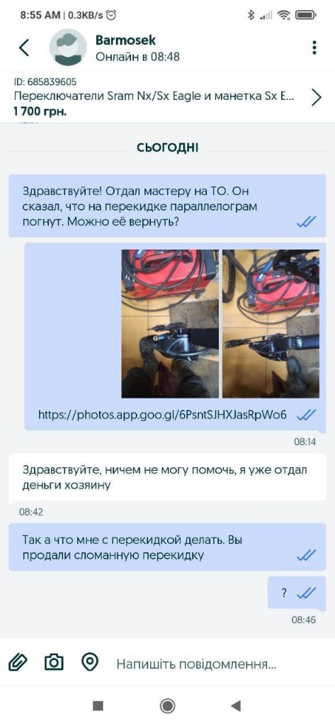Этот отзыв решил оставить, так как у продавца (https://www.olx.ua/uk/list/user/zKu5I/ , подписан Barmosek) есть много велокомпонентов и, скорее всего, такого же качества. Я всегда перед покупкой на OLX ищу информацию о продавце в гугле по номеру телефона )))