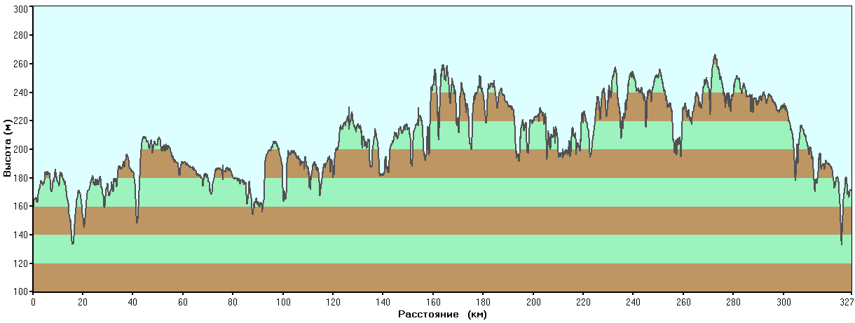 А теперь о конкретике. Выкладываю профиль первых 327 км трека - от точки старта до окончательного съезда на Е95 (немного не доезжая Ульяновки). До Одессы нужно будет добавить еще почти 300, там профиль известен.