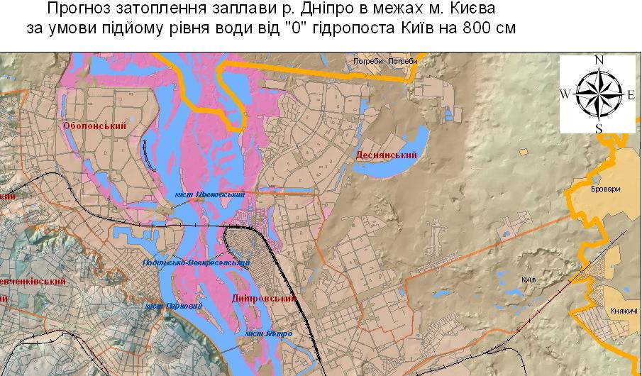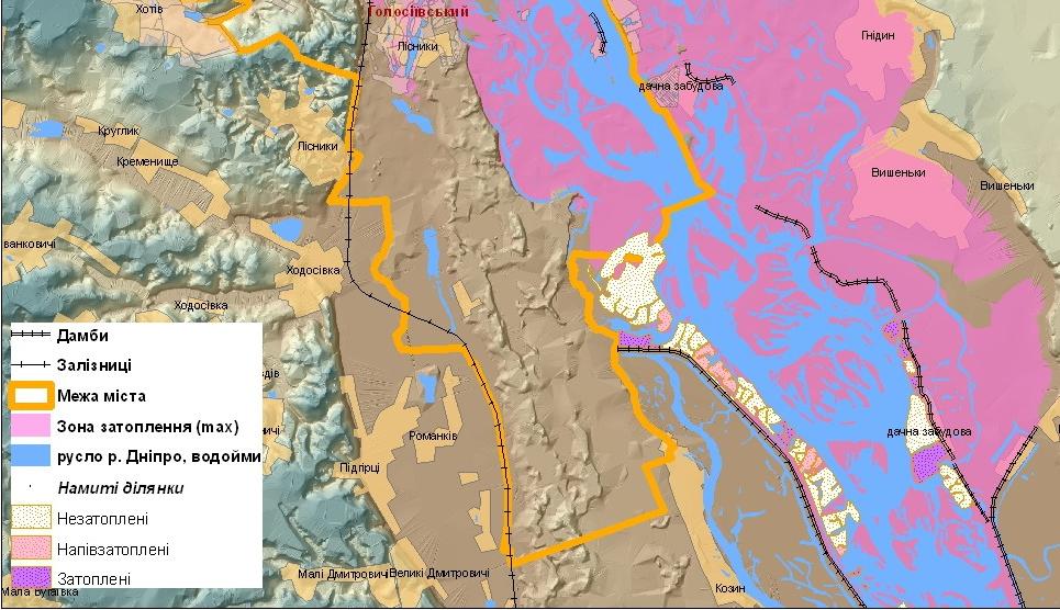 С учетом прогнозных уровней воды и отметок высоты берегов отметим, что при прогнозируемых уровнях воды не будут затапливаться дачный массив Русановские сады, защищенный дамбой с отметкой гребня 96-97 м БС. С учетом отметки 93.7 в районе пристани Осокорки может быть незначительно притоплена часть этого дачного массива. Будет превышен уровень переливной дамбы со шлюзами, защищающей массив Вишенки-Бортничи, с учетом отметки гребня этой дамбы 92.5-92.7 м БС, и будут затоплены пойменные луга до сел Вишенки и Гнедин, затопления в этих селах будут зависеть от отметок отдельных усадеб. Будут затоплены большая часть Труханова острова и острова Гидропарк, прибрежные территории в районе Корчеватого, территории с низкими отметками «за дамбой» в Конче-Заспе.