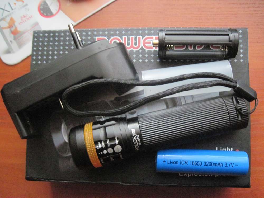 2.Набор Police BL -8417 ,диод Q3 , 3 режима - максимальный, эконом, сигнальный(мигающий),Влагозащищенный корпус из алюминиевого сплава. На фонаре существует фокусировка луча (дополнительные удобства при близком освещении). Элементы питания - три батарейки типа ААА в контейнере или аккомулятор lI - ion ICR 18650 3200 mAh 3.7 V.