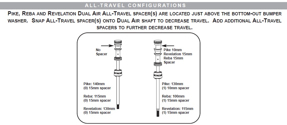 Нашел, спасибо! Да, действительно меняеться проставками. В моем случае даже проще. Мне нужно будет просто выкинуть проставку, чтоб увеличить ход.нет. это означает, что проставками all-travel в воздушной камере можно менять ход вилки. где именно там содержатся эти проставки, указано в сервис-мануале, который можно взять тут: http://www.sram.com/en/service/rockshox ... subcatID=8