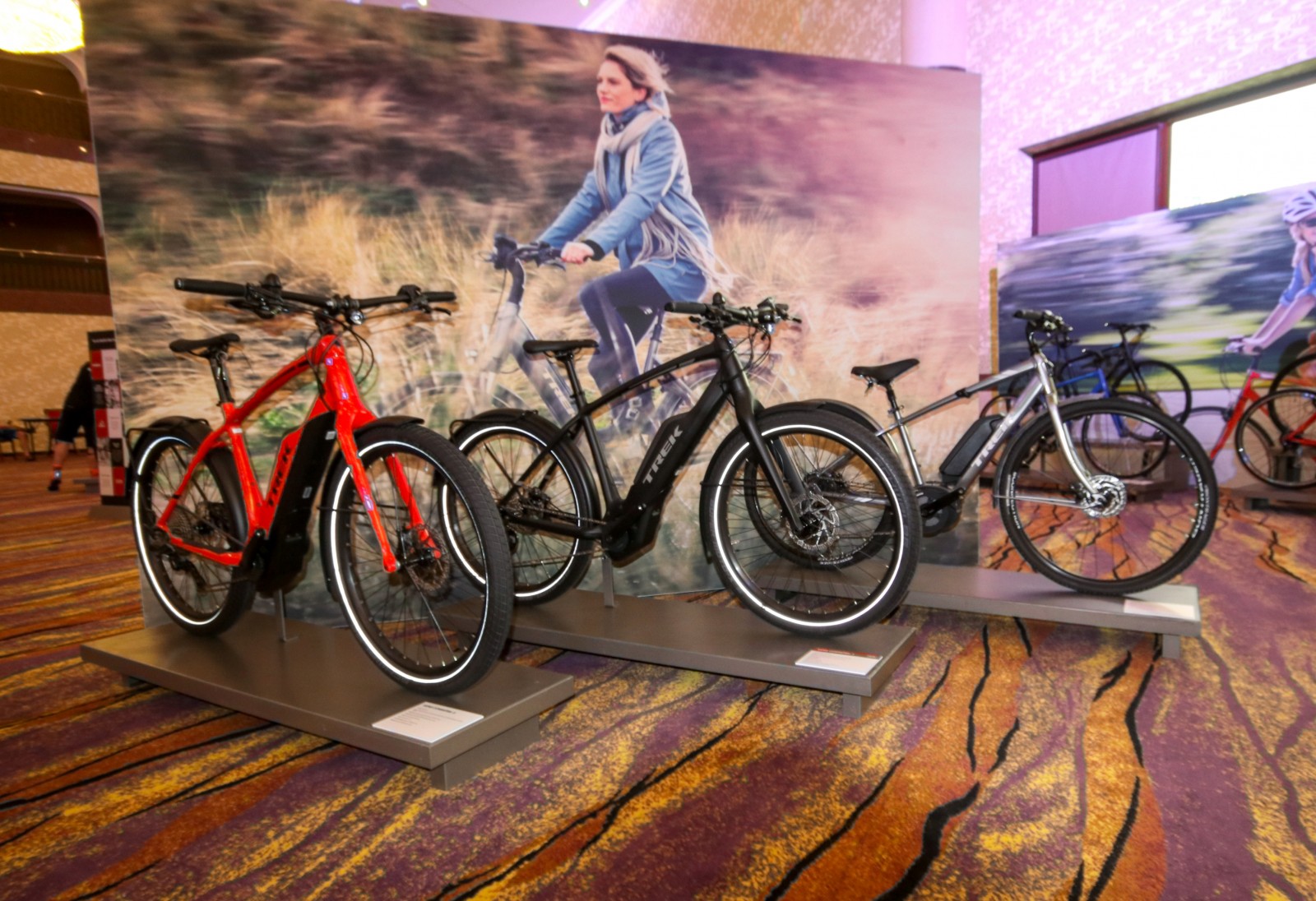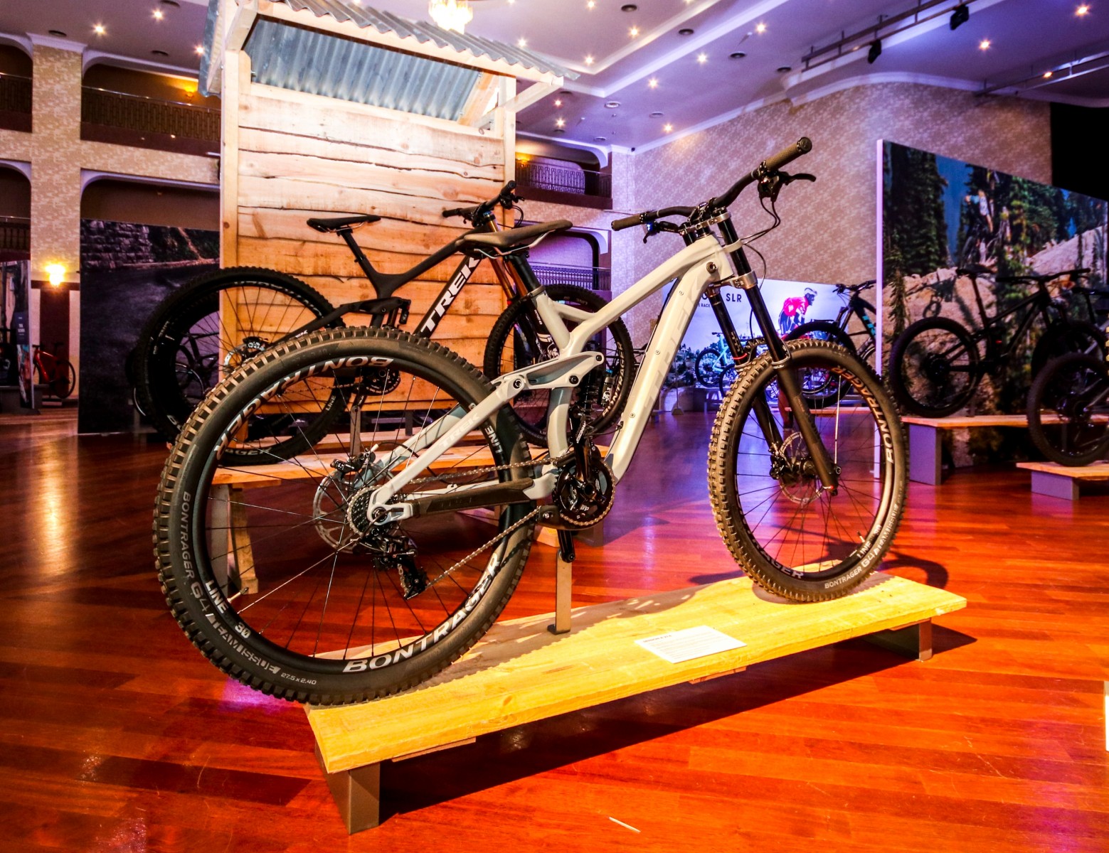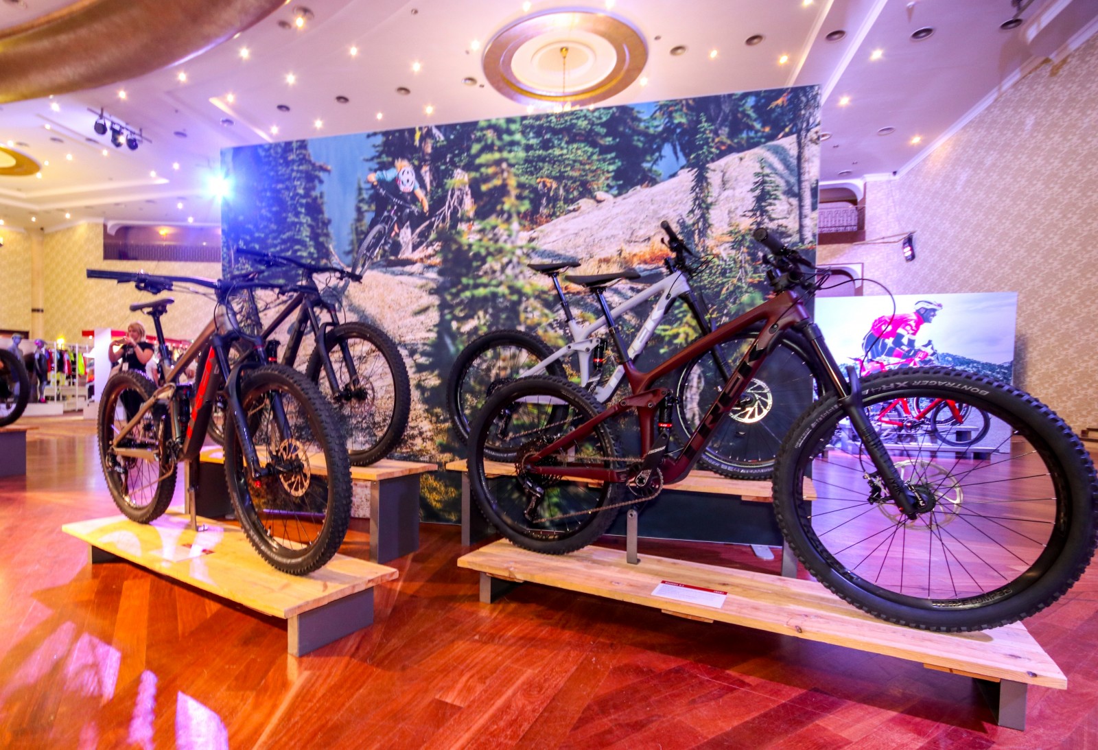 Далі посеред залу на окремих стендах розташувались гірські двопідвіси. Великий асортимент чоловічих Fuel Ex доповнювала лінійка жіночих. Занижений стендовер, дещо коротше кермо та положення на велосипеді відрізняє велосипеди прекрасною половини людства від звичайних.
