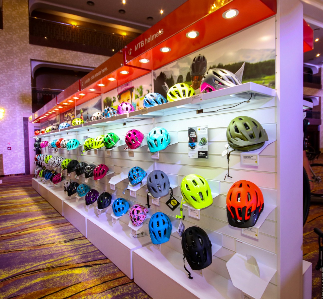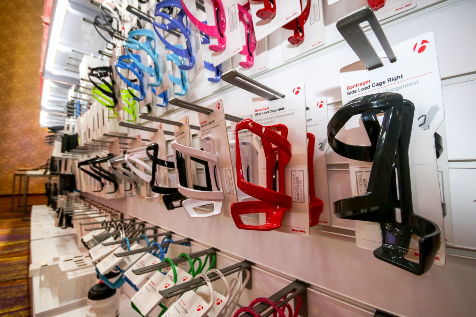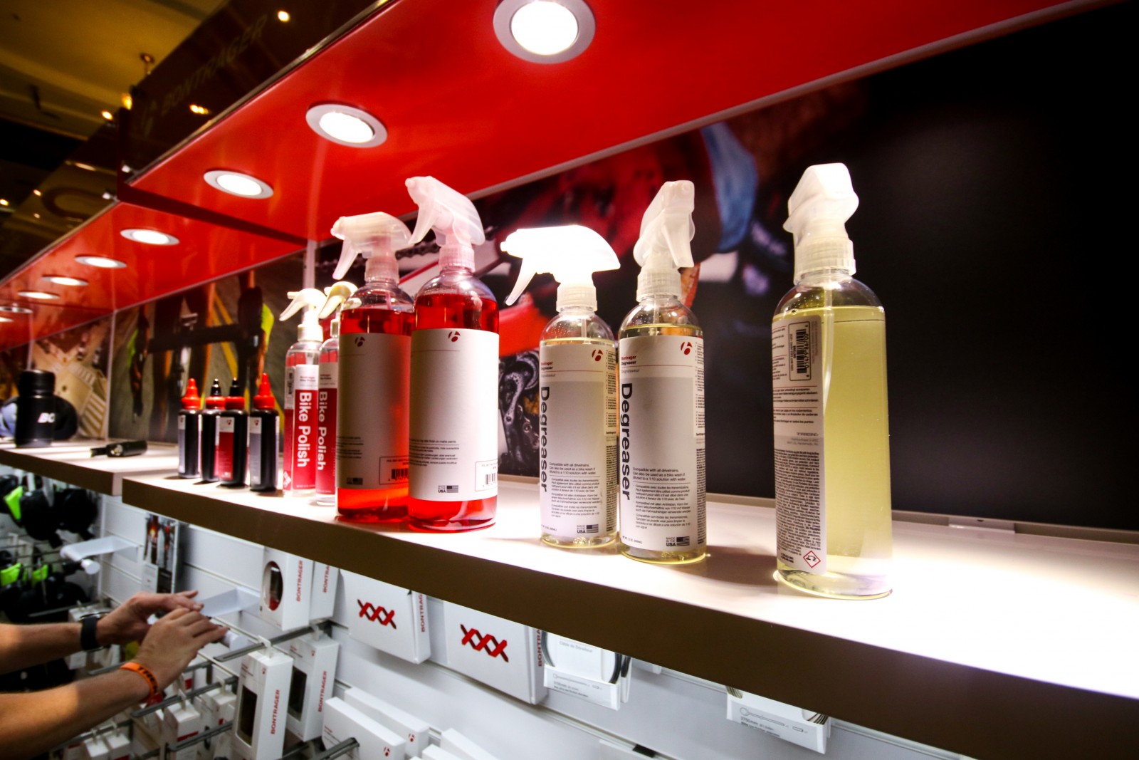 Яскраво освітлені стенди з компонентами, одягом та аксесуарами Bontrager.