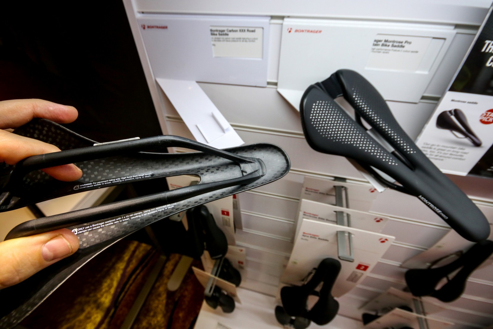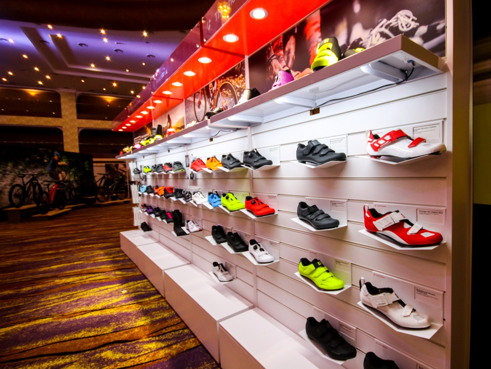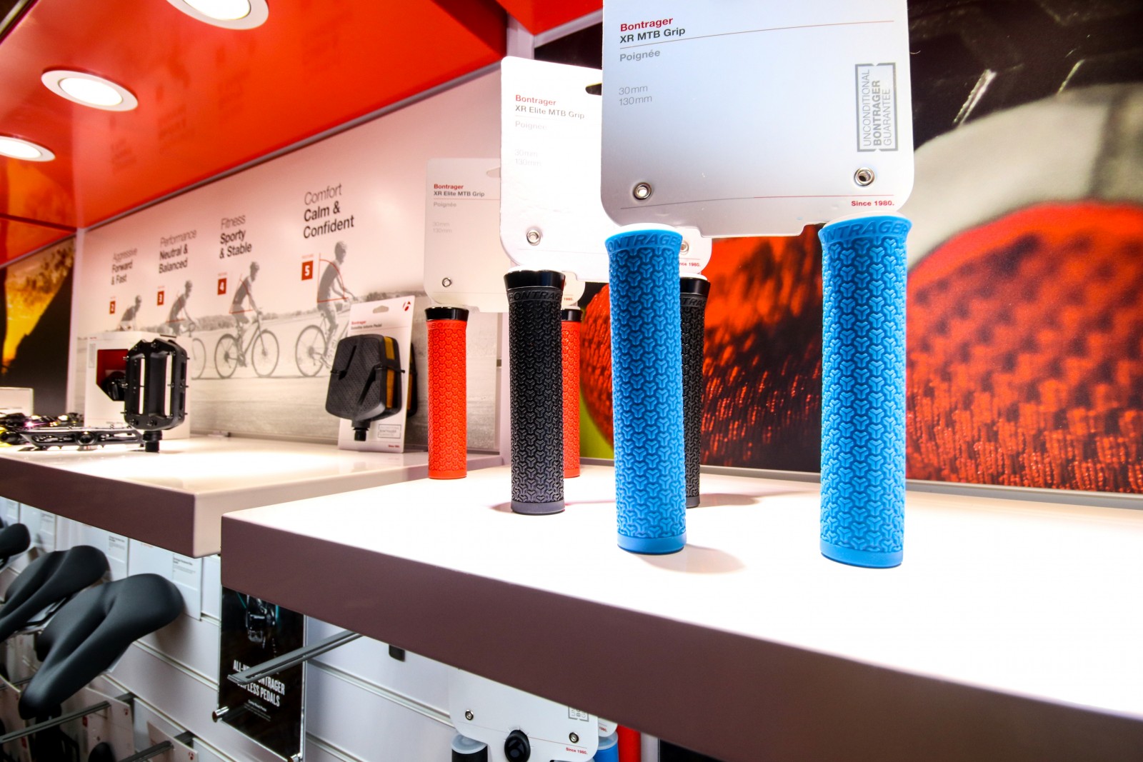 Яскраво освітлені стенди з компонентами, одягом та аксесуарами Bontrager.