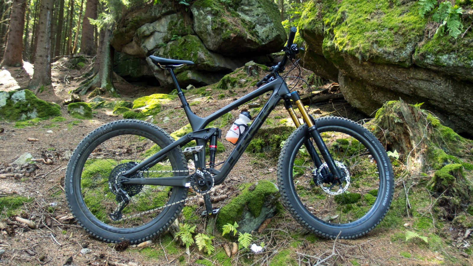 Велика колісна база, широкі та легкі карбонові колеса, взуті в агресивну гуму Bontrager SE4 650х2,6 та неймовірно м’яка та бездонна підвіска з фірмовим амортизатором Thru Shaft, робили спуск безпечним та прогнозованим. Швидкість завдяки ефективній взаємодії підвіски з рельєфом була приголомшлива.