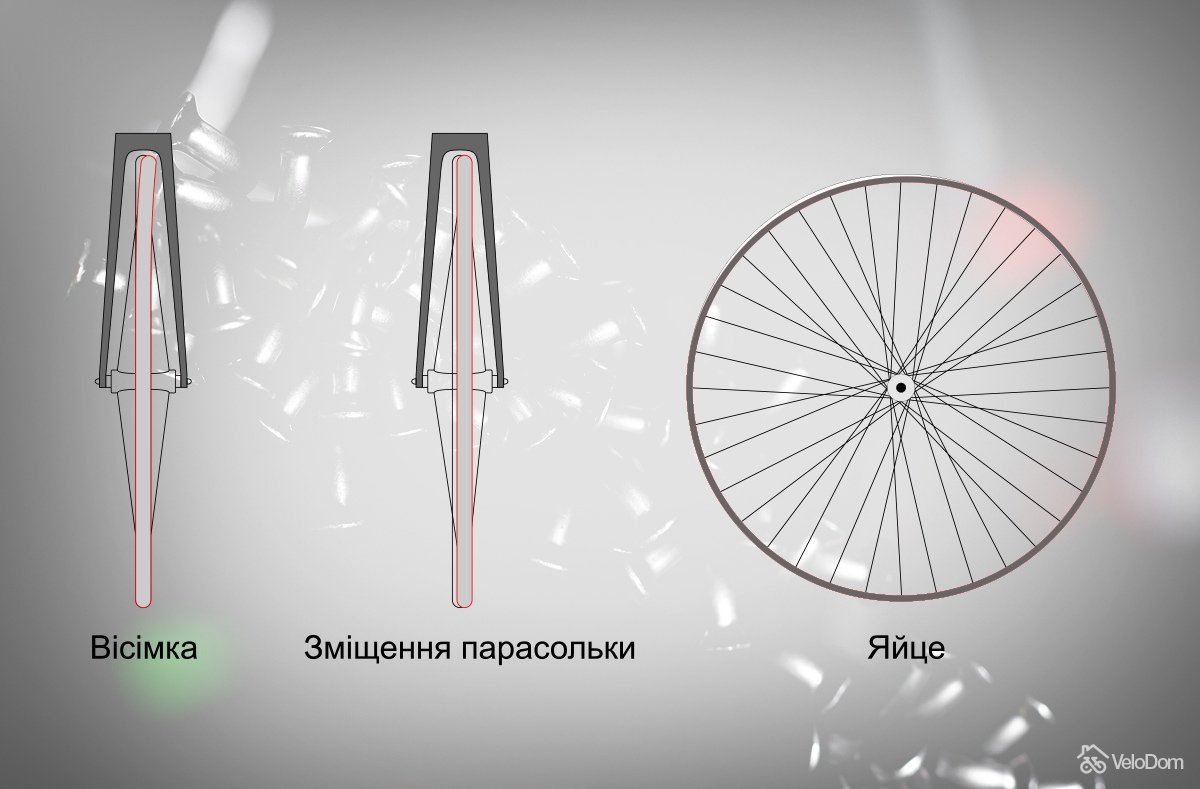 Так утворилася вісімка. Сегмент парасольки на "сильній" стороні розкрився на більший кут. Через збільшення кута добре натягнута спиця також втратила певну частину свого натягу, адже через відхилення скоротилася відстань від фланця до ободу.