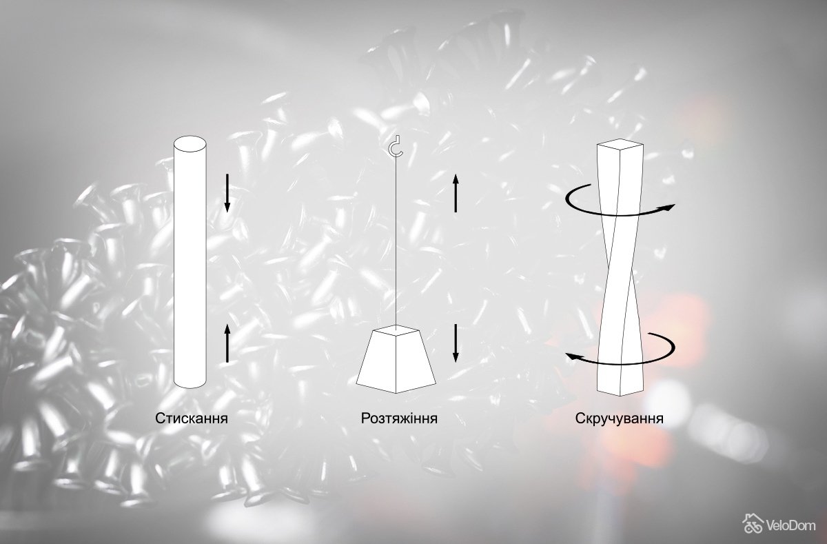 На колесо діють статичні та динамічні навантаження. Статичні навантаження, такі як натяжіння спиць або тиск повітря у камері, не змінюються або змінюються плавно протягом тривалого відрізку часу. Динамічні навантаження змінюються постійно. Їх три: розтяжіння, стискання та скручування.